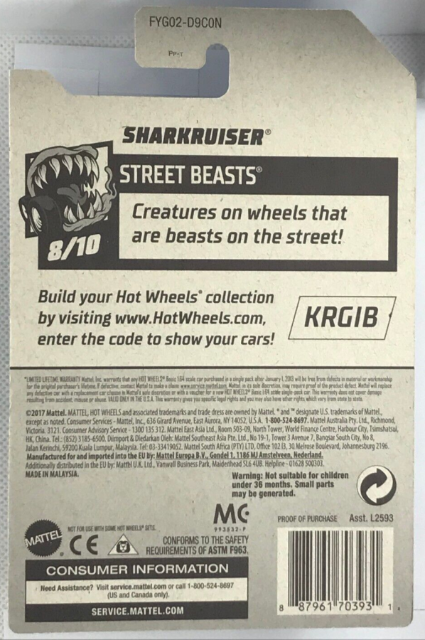 PART NUMBER: FYG02 HOT WHEELS #: 231 TYPE: Mainline NAME: Sharkruiser COLOR: Blue SERIES NAME: Street Beasts SERIES #: 8 DATE CODE: M19 CASE: N |
