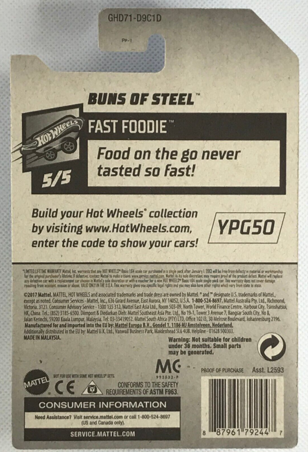 The car is blue in color and decorated with yellow french fries poking through the roof and a tan hamburger on the flatbed tray. The sides display black and yellow graphics with “Ted’s Burger Palace”. It features yellow windows and an unpainted metal base. The car comes with gold chrome 5-spoke wheels.