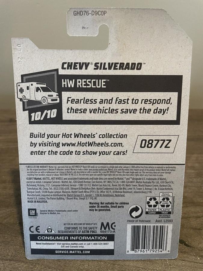 The car is bright green in color and decorated with checkered patterns and white, red, and black graphics. “Rescue” is found on the hood and “Trackside Emergency Response” is displayed on the doors. “Safety Team”, the Hot Wheels logo, and “HW Raceway” are on the sides of the car. It features tinted windows, a chrome interior and a black plastic base. It comes with PR5 wheels with black rims and yellow trim.
