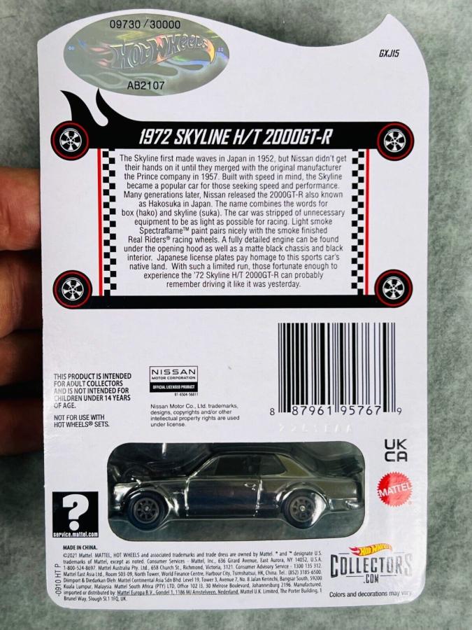 Year: 2021 Series: Special Edition Vehicle Number: GXJ15 Produced: 30,000 Release/Sale Date: October 5, 2021 Casting: 1972 Skyline H/T 2000 GT-R There are two different variant cards for this car. |