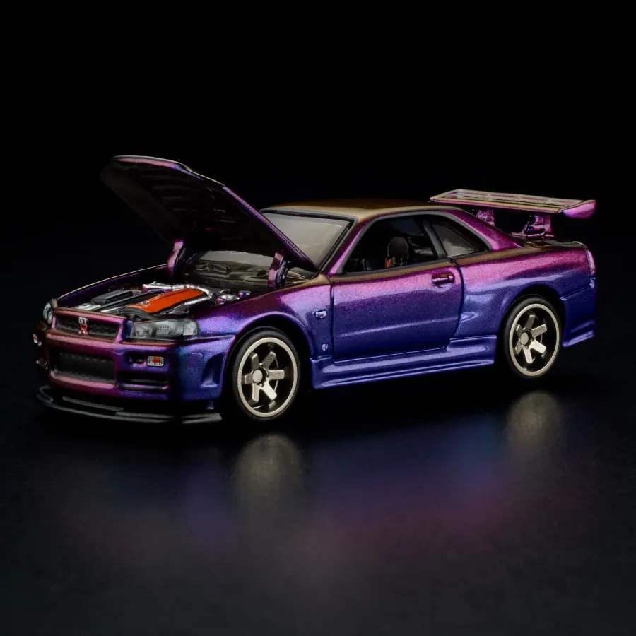 The Nissan Skyline GT-R BNR34 is the 5th generation in the GT-R series. Nissan’s GTRs already had a dominant reputation in the racing world, and the BNR34 sped into the scene ready to make its own mark. Improved aerodynamics due to body rigidity amped up its performance while taking nothing away from its stand-out style. Our Hot Wheels version features stunning chameleon paint that shifts colors in the light, and a ‘PURP’ license plate nodding to the awesome overall color of the car.