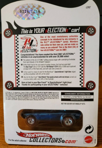 The Spectraflame light blue vehicle is decorated with blue flames, with a Red Line Club logo and “bye-focal” decorate the sides, “2FAST2C” is on the rear license plate of the vehicle. The Bye-Focal had tied with the ’69 Pontiac GTO as the third casting choice, Since both cars received 50% of the votes, both were produced.