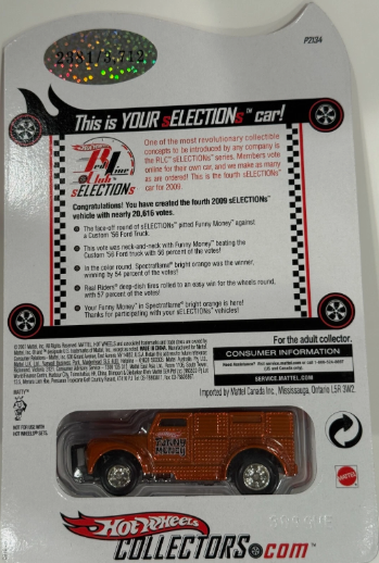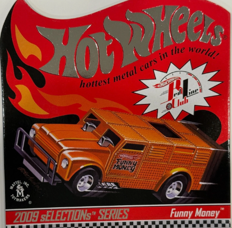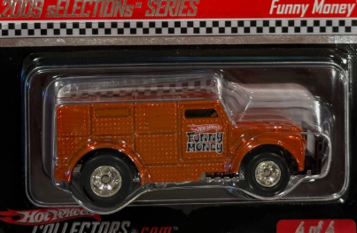 The Spectraflame bright orange vehicle with “Funny Money” and the Hot Wheels logo detailing the sides, and on the back of the truck is a Red Line Club emblem below a silver safe door.